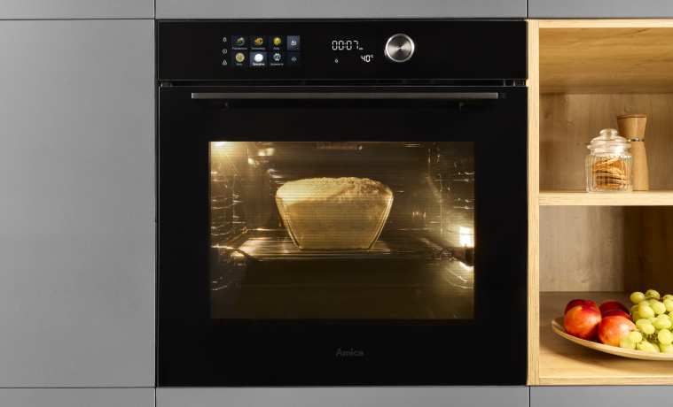 Nie tylko dobry przepis na chleb domowy pieczony w piekarniku jest ważny. Istotny jest także sposób jego pieczenia. Czy chleb wkłada się do nagrzanego piekarnika? Zasadą jest, że im mocniejszy start, tym bardziej chrupiąca skórka. Chleb wkładamy do piekarnika nagrzanego do 200℃. Jak upiec chleb z chrupiącą skórką? W nowoczesnych piekarnikach Amica równomierne pieczenie gwarantuje ThermoControl (np. TED57676ArBA+V PIZZA). Ten system stabilnej temperatury reguluje jej wysokość wewnątrz piekarnika. Dzięki temu nie ma wahań wysokości temperatury, co przekłada się na idealnie upieczone i równomiernie zarumienione ciasto chlebowe. Co zrobić, żeby chleb miał chrupiącą skórkę i wyglądał wyśmienicie? Efekt chrupiącej i lśniącej skórki może wzmocnić funkcja SoftSteam (np. ED37619X X-TYPE STEAM). Piekarniki Amica, które umożliwiają pieczenie z dodatkiem pary dają rewelacyjne efekty. Dzięki tej funkcji pieczywo doskonale wyrasta, jest puszyste, a na dodatek nie pęka i nie tworzy się zakalec. Cóż chcieć więcej?