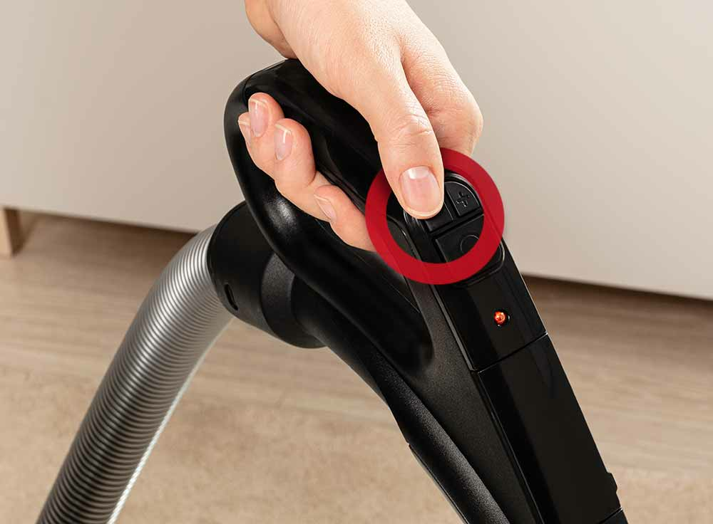 Koniec ze schylaniem się, by ustawić moc odkurzacza. Przyciski znajdujące się w rączce pozwalają na komfortowe włączanie, wyłączanie i regulowanie mocy odkurzania. Regulacja mocy w uchwycie umożliwia szybką reakcję jeśli tylko wciągniemy odkurzaczem zabawkę dziecka lub zasłonę.