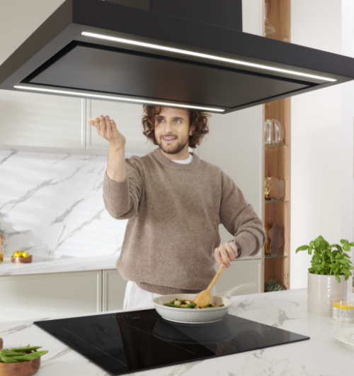 W pełni bezdotykowe sterowanie okapem oznacza, że sterujesz wyłącznie za pomocą gestu (lub pilota) ! Wystarczy krótki ruch, żeby uruchomić okap, zmienić jego moc lub włączyć oświetlenie. Możesz zapomnieć o czyszczeniu śladów po palcach na okapie.